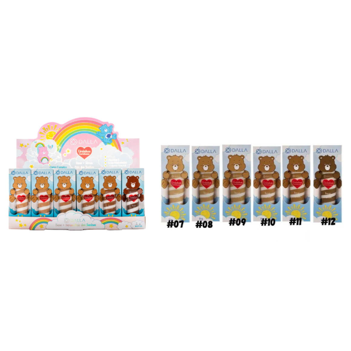 Descrição: A base + sérum "Pele dos Sonhos" da linha Ursinhos Carinhosos, da marca Dalla, é uma inovação no mundo da beleza que combina os benefícios de uma base com a eficácia de um sérum de cuidados com a pele. Inspirada no universo encantador e divertido dos Ursinhos Carinhosos, esta base + sérum promete proporcionar uma pele impecável e radiante, enquanto nutre e trata a pele.