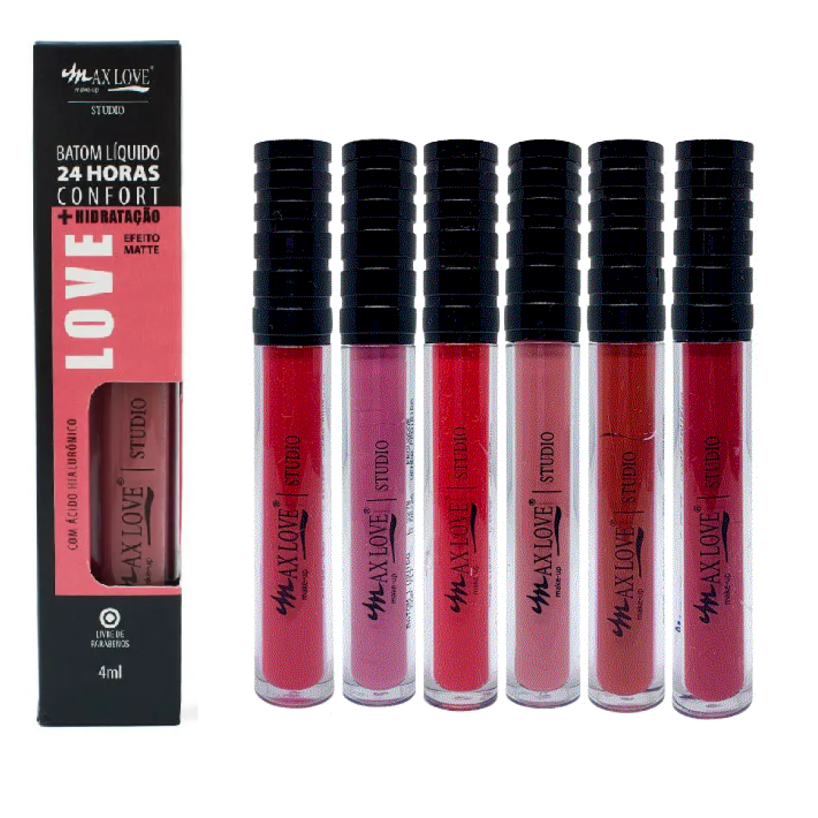 Descrição: O Batom Líquido 24 Horas Confort + Hidratação Max Love, combina a fixação e acabamento matte do batom líquido 24 horas, com a hidratação e o conforto de um batom cremoso em um único produto. Sua fórmula com Ácido Hialurônico, hidrata os lábios e sua textura permanece levemente maleável após a secagem, para acompanhar o movimento da pele dos lábios, evitando craquelamento.