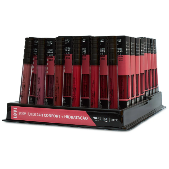 Descrição: O Batom Líquido 24 Horas Confort + Hidratação Max Love, combina a fixação e acabamento matte do batom líquido 24 horas, com a hidratação e o conforto de um batom cremoso em um único produto. Sua fórmula com Ácido Hialurônico, hidrata os lábios e sua textura permanece levemente maleável após a secagem, para acompanhar o movimento da pele dos lábios, evitando craquelamento.