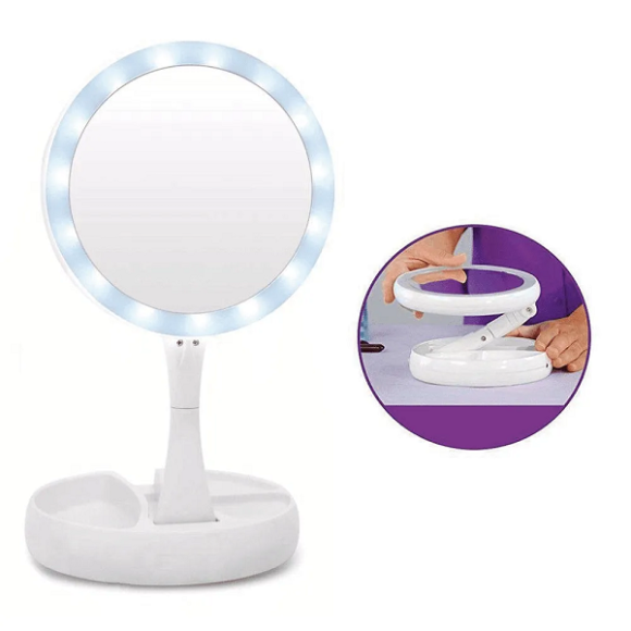 Descrição: Espelho compacto com LED pode ser usado em qualquer ambiente; Os LEDs são ligados através de 4 pilhas AA ou diretamente via USB; Possui compartimentos para guardar itens pequenos, como batons, cílios, lentes de contato e etc.