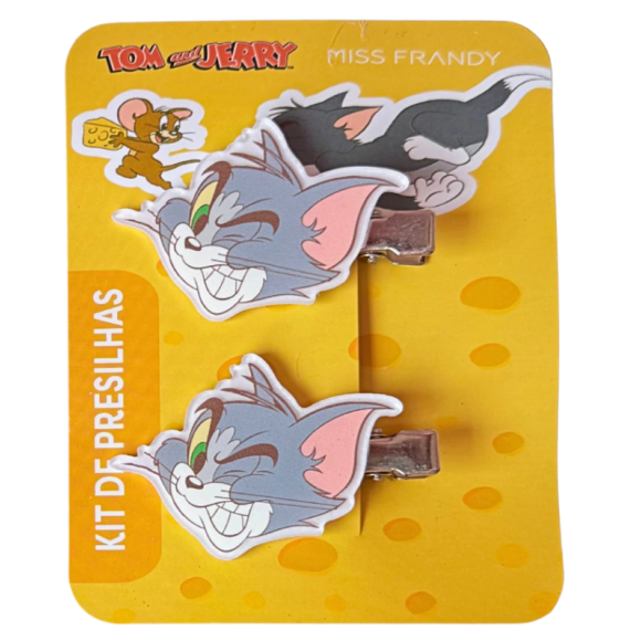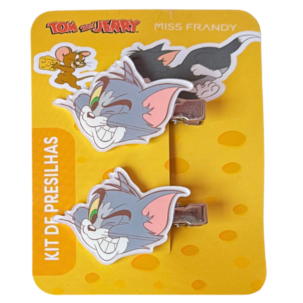 Descrição: As presilhas Tom & Jerry Miss Frandy são um kit de presilhas de metal, revestidas e com estampas dos personagens Tom e Jerry, projetadas para prender o cabelo com segurança e adicionar um toque divertido ao visual