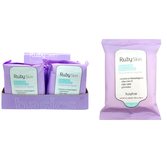 Descrição: O Lenço Facial Demaquilante Ruby Skin Ruby Rose remove a maquiagem, oleosidades e impurezas da sua pele, deixando-a limpa, fresca, tonificada e hidratada. Os lenços são resistentes e com uma fragância suave de algodão sem deixar a pele irritada, tornando a rotina de limpeza da pele bem mais simples.