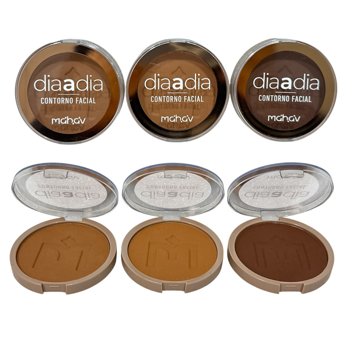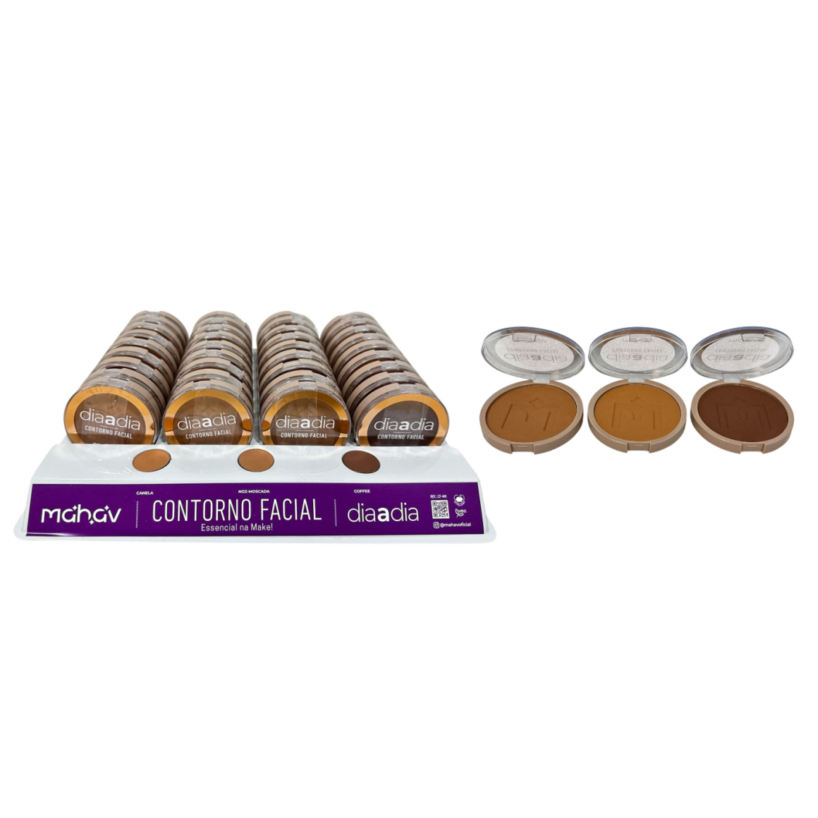 Descrição: O Contorno Facial Compacto Dia a Dia Mahav é composto por 1 tom de contorno, em duas versões, que irão te auxiliar nas técnicas de iluminação, contorno, finalização e acabamento da pele.