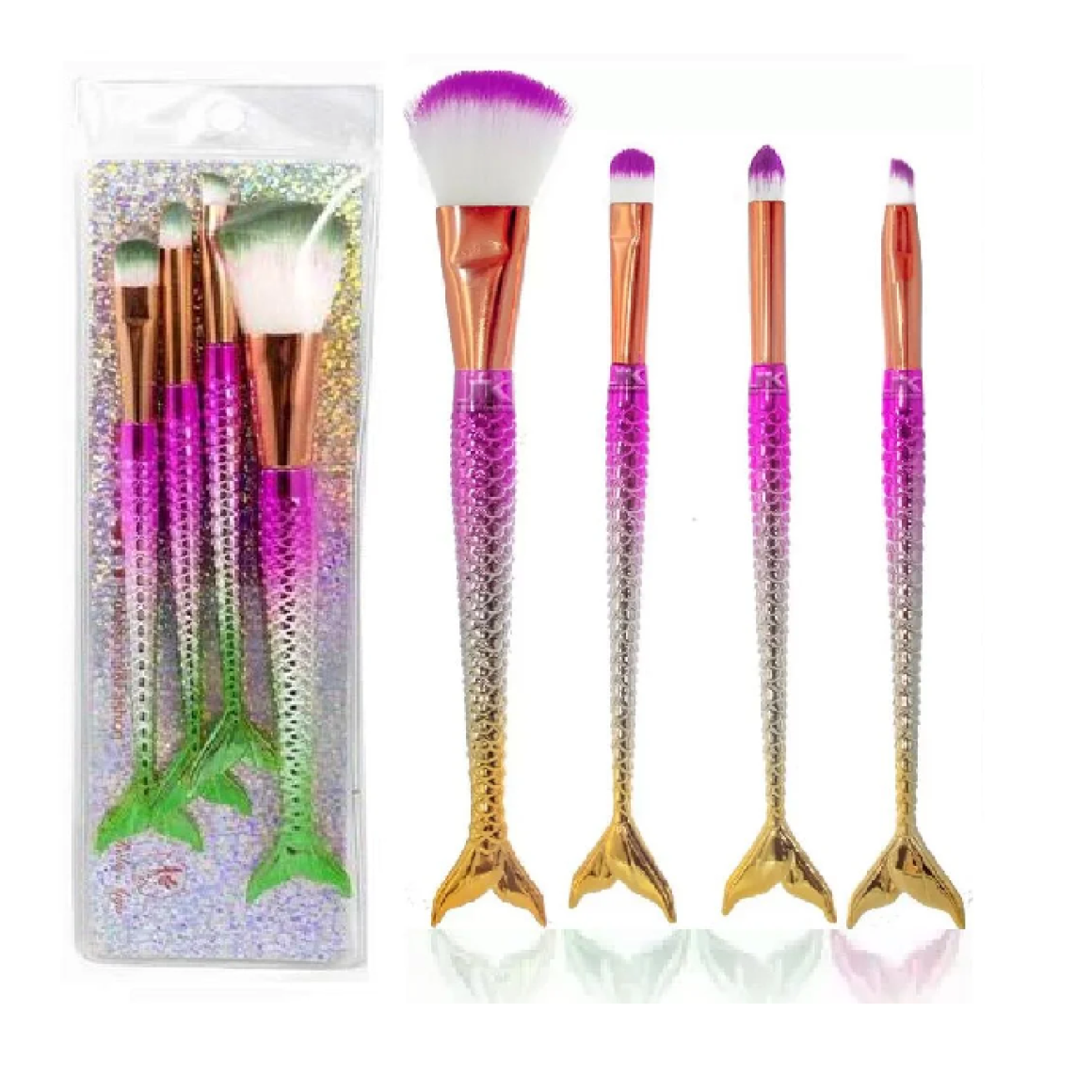 Descrição: Pincéis para maquiagem com cabo em formato de cauda de sereia, estilo único. São indicados para aplicação de pó, blush, corretivo, contorno e sombra. Fáceis de utilizar. Possuem cerdas sintéticas super macias de qualidade, que contribuem para um acabamento suave, natural e delicado.