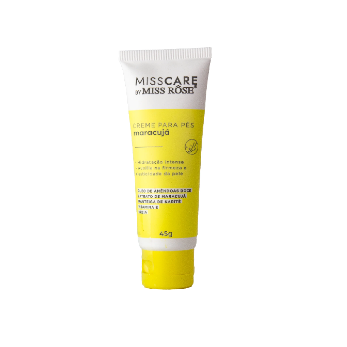 Modo de usar: Aplique uma quantidade generosa do Creme Para os Pés de Maracujá Miss Rôse nos pés limpos e secos. Massageie até total absorção, focando nas áreas mais ressecadas e ásperas. Pode ser usado diariamente, especialmente à noite, para um cuidado intenso.