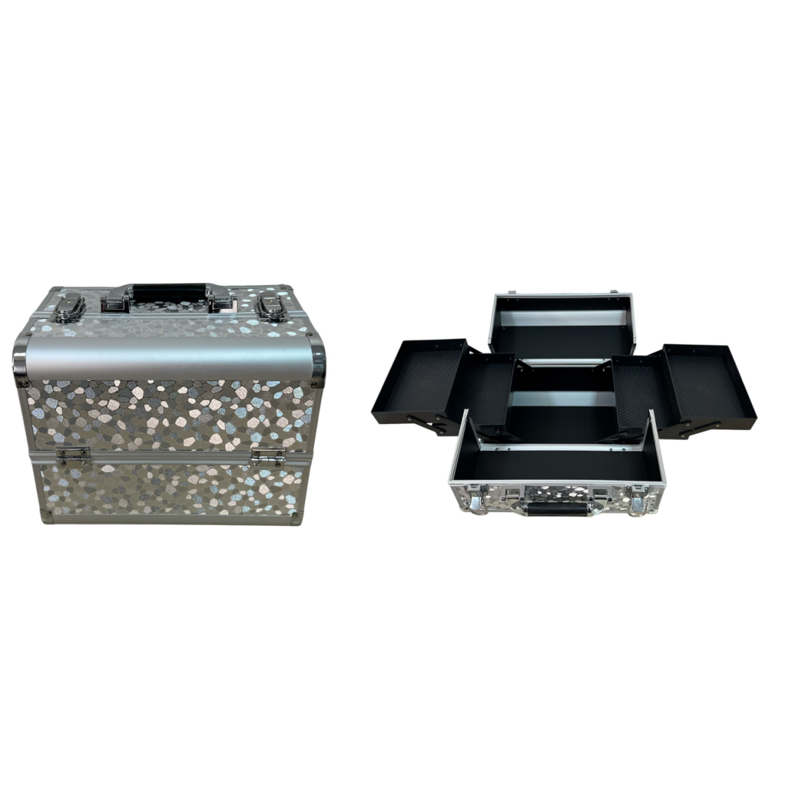 Descrição: Uso profissional e pessoal; Para guarda e transporte de maquiagens, bijuterias, joias e acessórios; Acessório que não pode faltar para os maquiadores; Design e estampa modernos; Lindo acabamento com perfis de alumínio; Fechadura com 2 chaves (1 reserva);