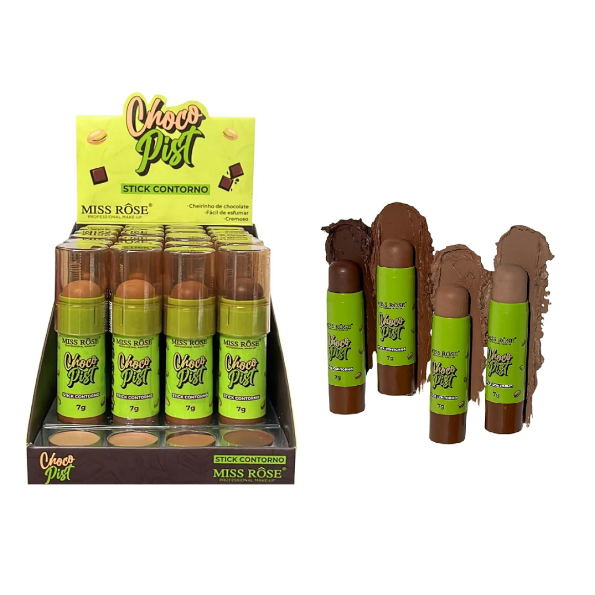 Descrição: O Contorno Stick Chocopist da Miss Rôse tem textura cremosa, fácil de aplicar e esfumar, garantindo um acabamento natural e sem manchas. São 4 tonalidades versáteis, com subtons bem equilibrados: 2 tons quentes e 2 tons frios, para atender diferentes tons de pele e estilos de make. Perfeito para criar desde contornos suaves até os mais marcados.