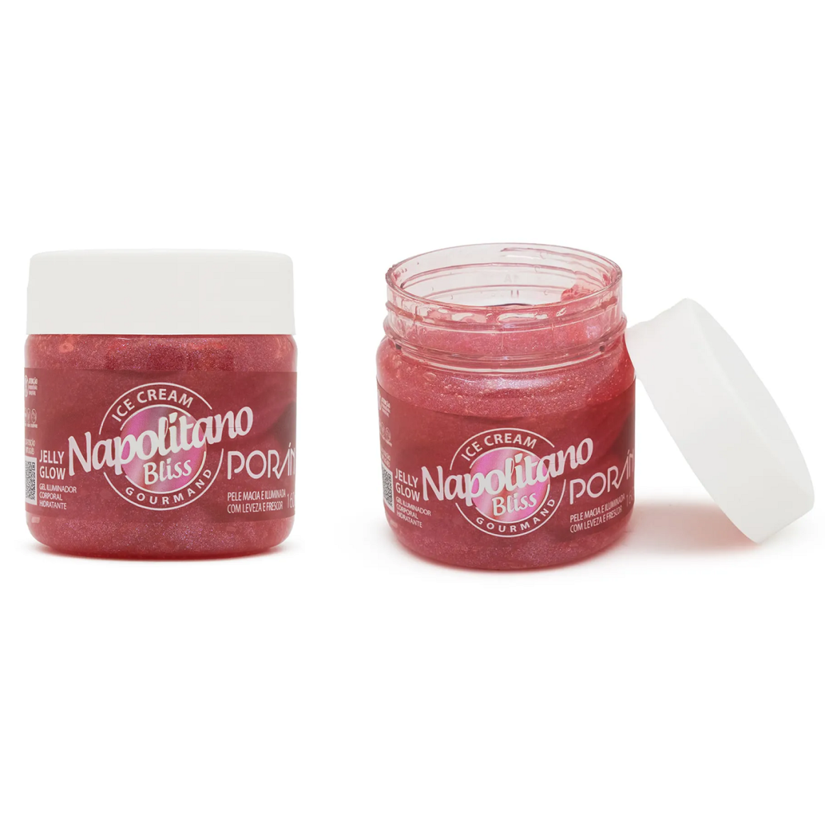 Descrição: O Gel Iluminador Jelly Glow Napolitano Bliss Porán é um gel corporal hidratante que combina cuidado e brilho em uma textura leve e refrescante. Sua fórmula desliza facilmente sobre a pele, proporcionando hidratação imediata e um toque radiante que valoriza o brilho natural. Deixa a pele macia, iluminada e delicadamente perfumada com fragrância envolvente.