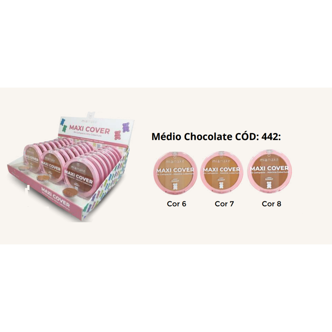 PÓ COMPACTO MAXI COVER GUMMY MEDIO CHOCOLATE MIA MAKE CX 24 PÇS
